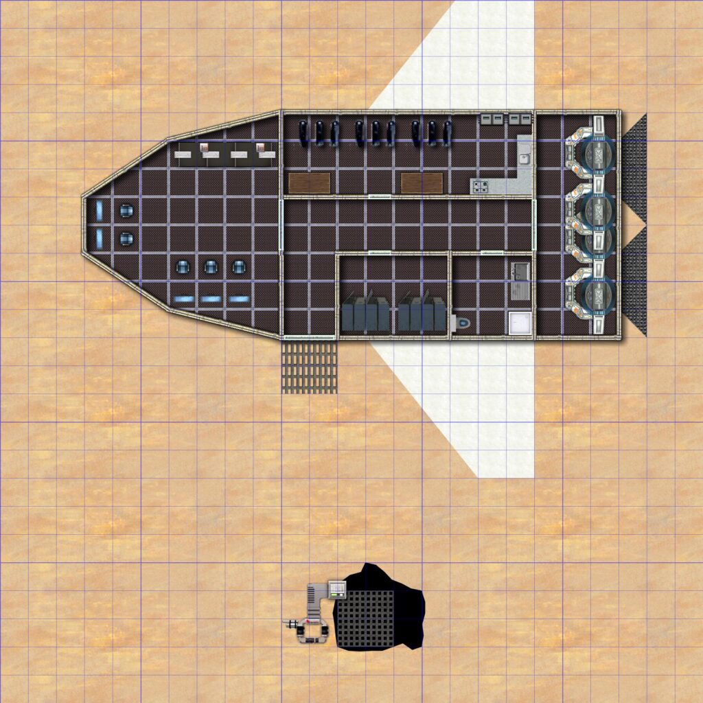 Upon approaching the ship, the players will find that it is closed and that there are no visible signs of damage. A Computer check of 7+ or a Raw Force check of 8+ can open the door to the ship. If the players explore The Dig Site first and find a team member’s ID Card, then they can open the door without a check.